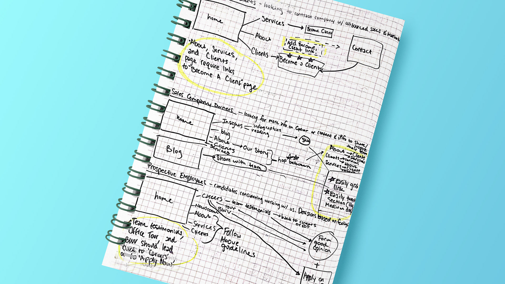 I sketched the new structure of the Home, Careers, and Clients pages keeping in mind the user, the new content, and the cohesion between the older pages with the eventual site rebrand.